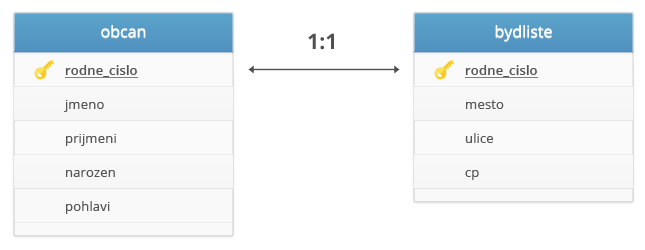 Příklad: Tabulka občan obsahuje informace (jméno, příjmení) o daném jedinci, druhá tabulka obsahuje data o jeho trvalém bydlišti (Ulice, Město, ČP). Propojení pomocí rodného čísla, které v obou tabulkách reprezentuje primární klíč.