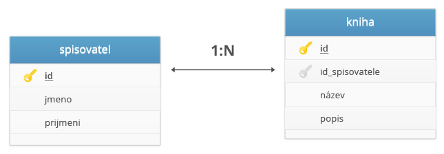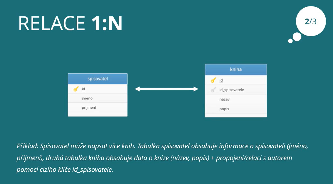 Příklad: Spisovatel může napsat více knih. Tabulka spisovatel obsahuje informace o spisovateli (jméno, příjmení), druhá tabulka kniha obsahuje data o knize (název, popis) + propojení/relaci s autorem pomocí cizího klíče id_spisovatele.