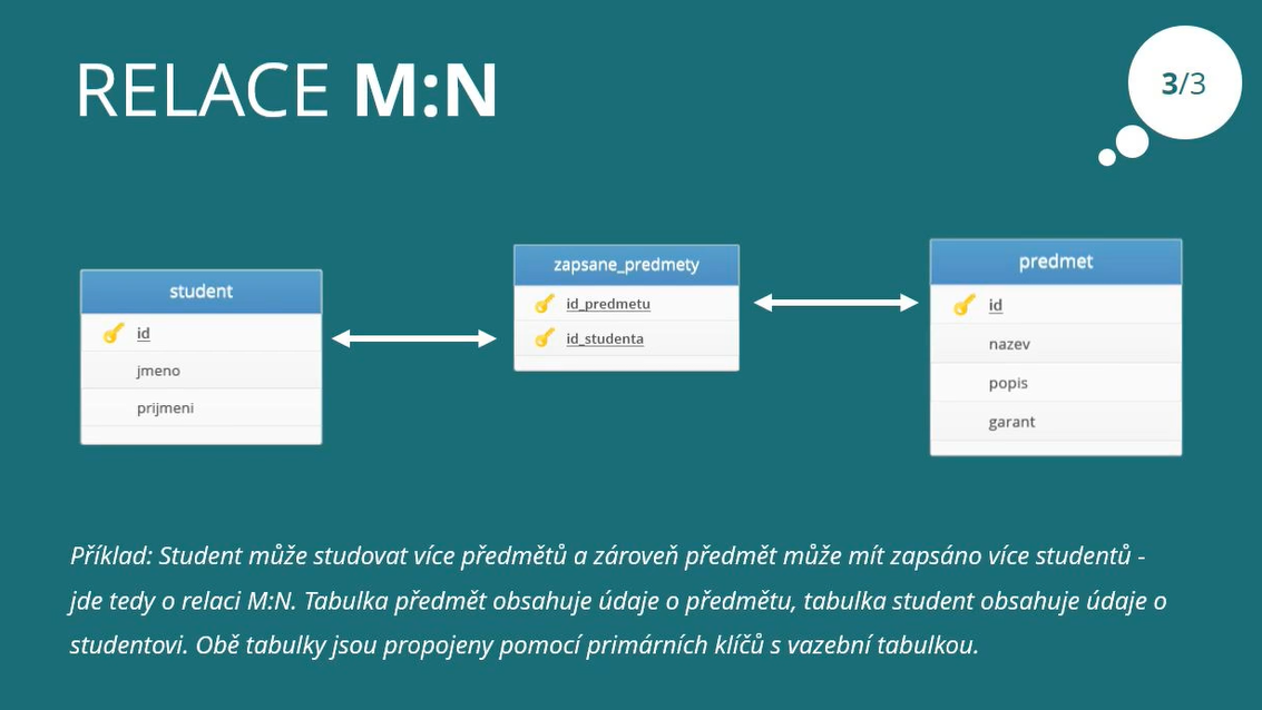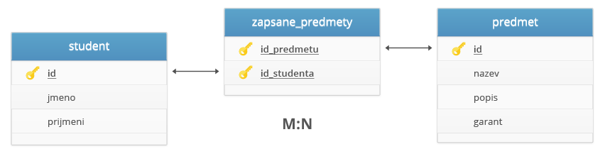 Příklad: Student může studovat více předmětů a zároveň jeden předmět může mít zapsáno více studentů - jde tedy o relaci M:N. Tabulka předmět obsahuje údaje o předmětu, tabulka student obsahuje údaje o studentovi. Obě tabulky jsou propojeny pomocí primárních klíčů a pomocí vazební tabulky. V případě potřeby můžeme vazební tabulku rozšířit o další atributy. Např. datum zápisu předmětu.