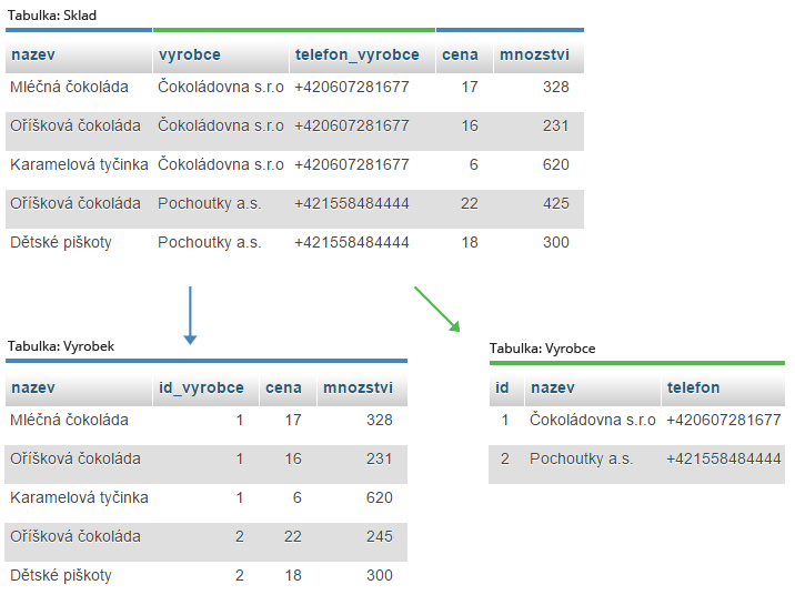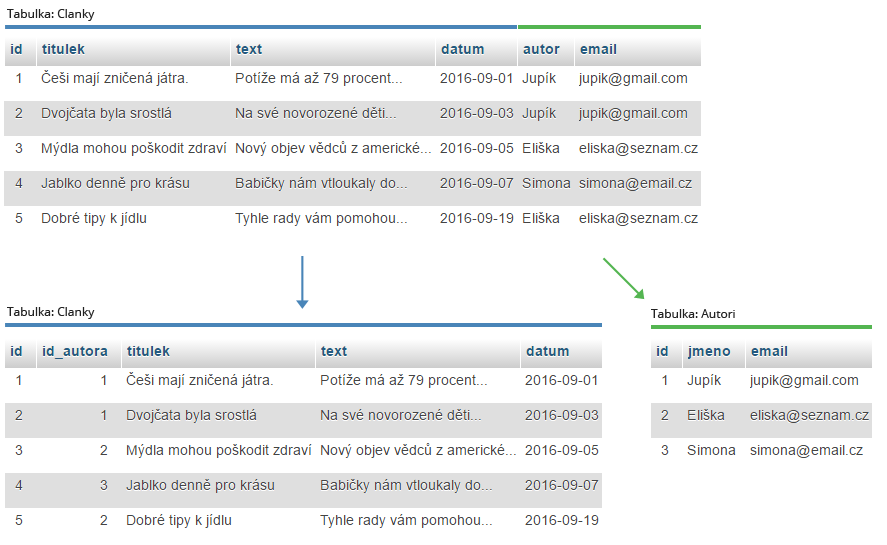 Příklad: Máme internetový magazín, do kterého svými články přispívá více autorů. V databázi máme tabulku články, která obsahuje ID, titulek, text, datum, přezdívku autora a e-mailovou adresu. Autorův e-mail se však spíše než na samotném článku závislý na autorovi. Oddělíme tedy údaje o autorovi do nové tabulky. Tím nám navíc odpadá spousta opakujících se údajů, v případě publikování více článků jedním autorem. Navíc máme tabulku se seznamem autorů se kterou můžeme také různě pracovat.