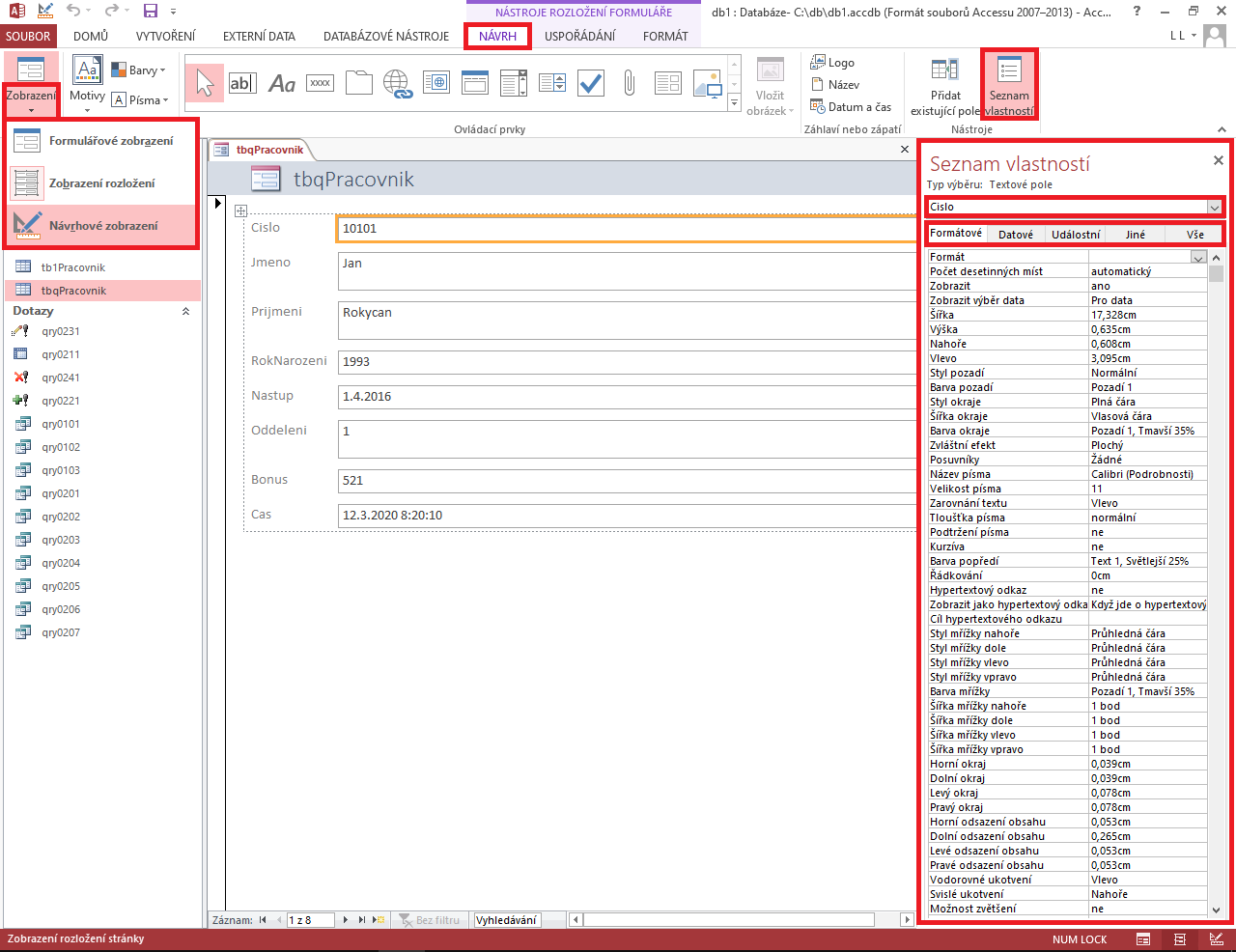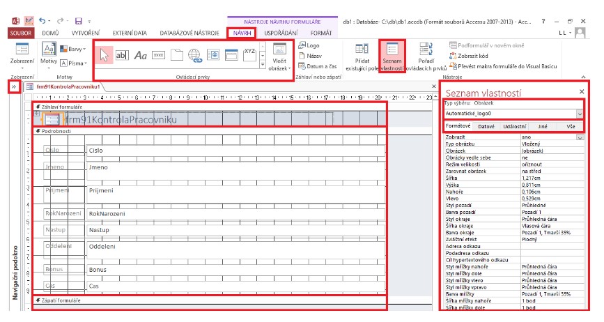 K úpravám formuláře v návrhu je třeba mít reálné zobrazení formuláře a některé běžně užívané nástroje. Nejčastěji se pracuje se zavřeným Navigačním podoknem na levé straně obrazovky, které se dá znovu otevřít klepnutím na ikonku >>. V záhlaví je nastaveno menu NÁVRH a na jeho pásu karet jsou podstatné Ovládací prvky a ikona Seznam vlastností, která otevírá po pravé straně podokno Seznam vlastností s členěním: